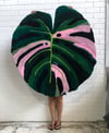 Handmade Tufted Monstera Leaf Rug with pink accents.